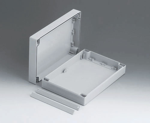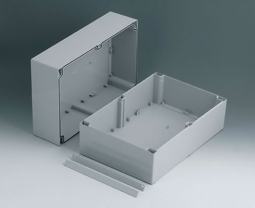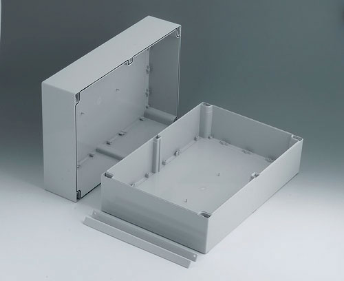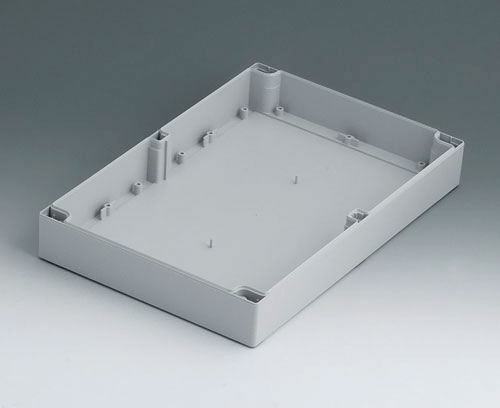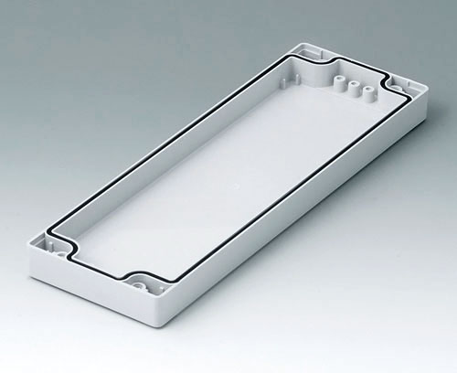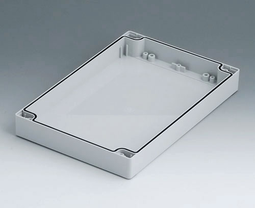 ROBUST-BOX WIDTH 240, Vers. I Robust plastic enclosure, ideal for electrical and electronic applications. Case shells either usable as top or base part. Each case part contains threads and fixing towers. Screw fixing outside of the sealing area. Recess of approx. 0.8 mm for use of membrane keyboards.