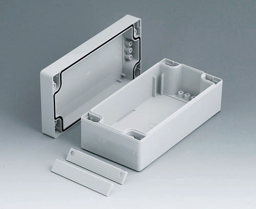 ROBUST-BOX WIDTH 200, Vers. I Robust plastic enclosure, ideal for electrical and electronic applications. Case shells either usable as top or base part. Each case part contains threads and fixing towers. Screw fixing outside of the sealing area. Recess of approx. 0.8 mm for use of membrane keyboards.