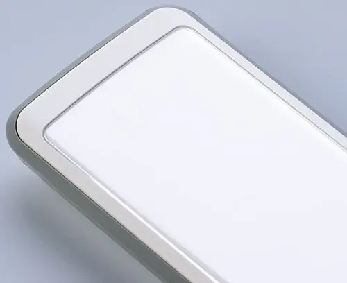SLIM-CASE M, Vers. VI 3-piece handheld enclosure with TPE intermediate ring, compact design, with a large operating panel of up to 4" (10 cm). Comfortable grip thanks to enclosure contours that are rounded along the sides and intermediate ring made of TPE, which also serves as impact protection and as a sealing ring for protection class IP 54. Recessed operating panel for using a contoured transparent front screen (available as an accessory with adhesive film) or for protecting individual membrane keyboards. Fastening pillars for mounting PCBs in top and bottom parts.