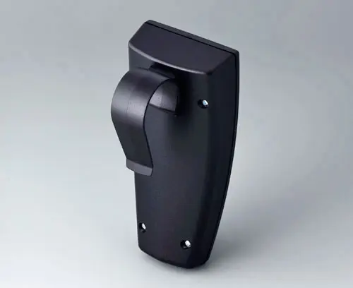 SMART-CASE M, Vers. VI Ergonomic handheld case composed of two parts. Location at the front along with a screw in the center of the case. Possiblities for fixing PCBs in top and base part.