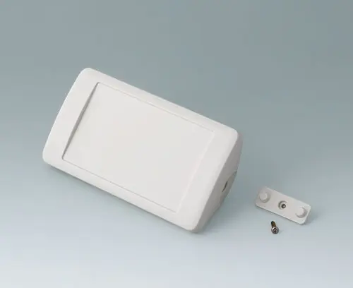 Two-part plastic enclosure with recessed panel to protect the membrane keypad / décor foil. The basic triangular shape allows it to be used in corners or at an ergonomically favourable angle of 45°. Robust design with proven tongue and groove assembly. Case assembled with Torx drive stainless steel screws. Protection class IP 40 without optional sealing kit. Fastening pillars for PCBs and components in the top and bottom parts.