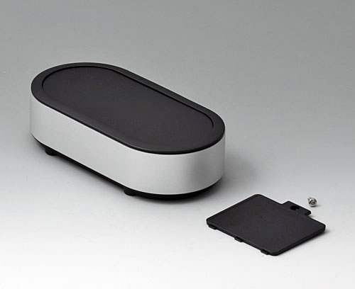SYNERGY R100 4-part enclosure for many different applications. Sturdy frame made of aluminium, glass bead-blasted and anodised. Plastic parts made of ASA+PC-FR with high UV protection and high flame resistance. Attachment domes for PCBs and components in the top and bottom parts. Top part with recessed surface to protect the membrane keyboard. Bottom part with opening and screw-down cover: practical for the use of a battery compartment or for access to the interior, e.g. for a memory card or batteries that are mounted directly on the PCB. Battery compartment kit 2 x AA with contact springs, battery clips, button cell holder and wall mounting option as accessories.