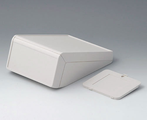 UNITEC M, 0.6/1.4 Plastic enclosure with two operating panels rectangular to each other, optionally for single or dual use. Front part recessed 0.6 mm. Top part recessed 1.4 mm. Fastening pillars for mounting of PCBs in top, base and front part.