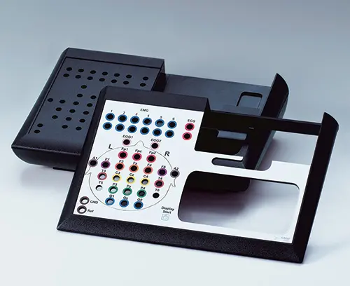 The stationary EEG system is installed in a modified OKW enclosure and serves as the basis for an EEG amplifier. In the upper right-hand area, there is a holder in which the recorder from the SOMNOscreen plus range is integrated. The device is only functional when the two components are combined. A touch screen which receives the measured signals (EEG, ECG, EMG, oxygen saturation etc.) via Bluetooth and displays them in real time is also integrated.