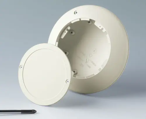 Assembly unit: With bayonet lock, snapping into place. If required securing using 2 screws. Screw pillars for PCBs in bottom and top part. Screw pillars for battery compartment (acc.) in bottom part. End piece (lid / battery compartment lid / base) required for bottom part - see separate article.