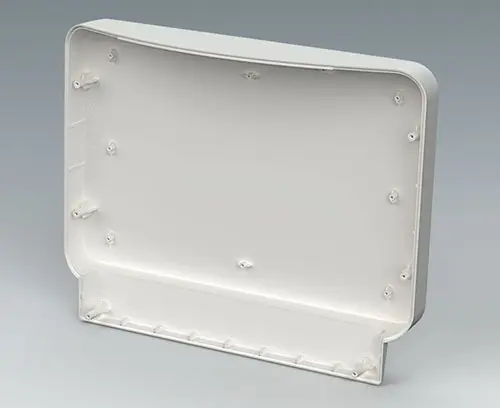 Order with COMMUNITEC M basic housing. Features a recessed area for protecting membrane keypads and integrating large-format displays up to 14" (35 cm), with a flat area below for front-mounted control elements and connectors. Includes integrated fastening pillars for PCBs or mounting plates. The operating panel is installed from the rear.