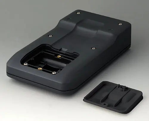 3-part compact hand-held enclosure with sealing and with an ergonomic, robust design. Ideal for miniaturised electronics applications. Secure grip through finger recess in the bottom part and centre of gravity near the body. With a battery compartment, accessible from the outside, for 3 x 1.5 V AA batteries. Recessed user area to protect the operating elements. Attachment domes for PCBs and components in the top and bottom parts.