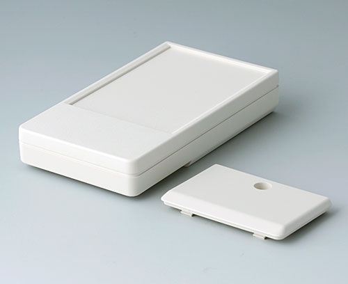 Robust pocket-box with sealing. Recessed control area for membrane keyboards. Screw pillars prepared for mounting PCBs in the top and base. Battery compartment accessible from the outside with screwed battery compartment lid in case bottom. Battery compartment for 2 x 1.5 V micro cells (AAA).