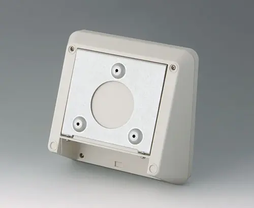 PROTEC 180, Vers. II Modern three piece plastic enclosure with an ergonomically inclined operating panel. The snap-on cover included in the supply makes it possible to close the deep recessed interface area at the rear both visually and/or to install additional electronics in a separate area. Fastening pillars for PCBs and components in the top and bottom parts. Wall suspension element and sealing (to raise the protection class up to IP 65) included in the range of accessories. Hidden stainless steel assembly screws with secure Torx heads. Can also be used outdoors thanks to the high-quality material and the robust design.