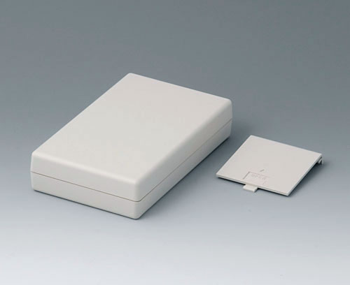 Two-part plastic case with closed front and rear. Guide ridges and fastening pillars for mounting of PCBs in top and base.