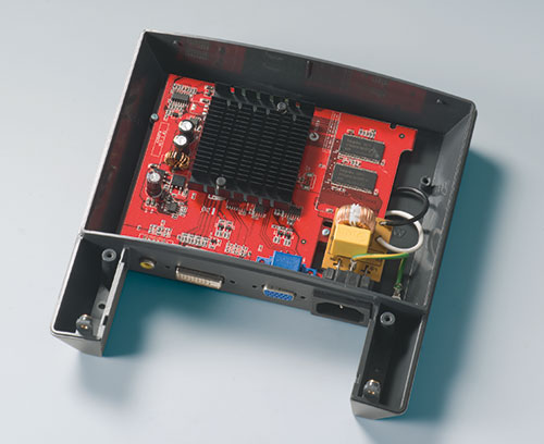 NET-BOX 180, исп. II Корпус, состоящий из трёх частей, со скрытыми сборочными винтами. Современное сочетание светло-серого и тёмно-серого цветов. 4 монтажные бобышки в нижней части и в крышке основного отсека. Может применяться вне помещений благодаря высококачественной пластмассе АСА+ПК-ОС.