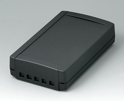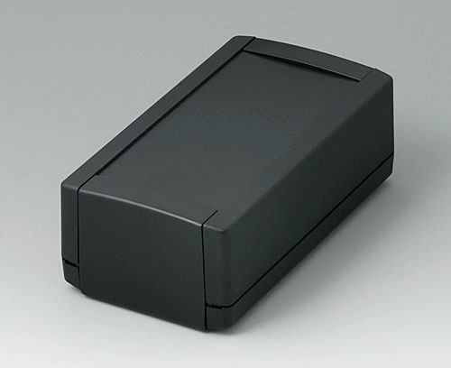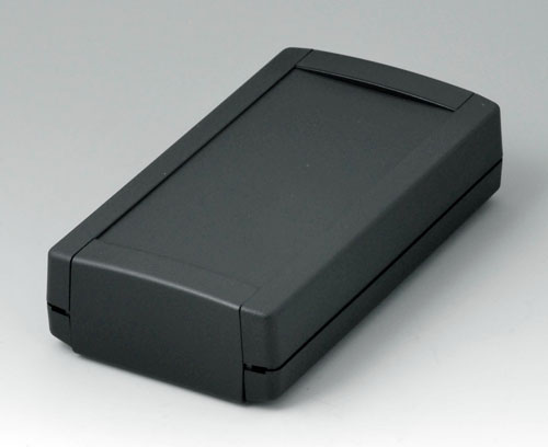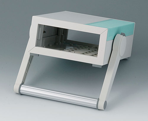 MOTEC L, с ручкой Настольный корпус с ручкой, состоящий из низкой нижней части и высокой верхней части. Шаг вращения ручки 30°. Открытый спереди и сзади. Монтажные бобышки для печатных плат и вертикальные направляющие. Лицевая и задняя панель (поставляются отдельно) вставляются в пазы корпуса.