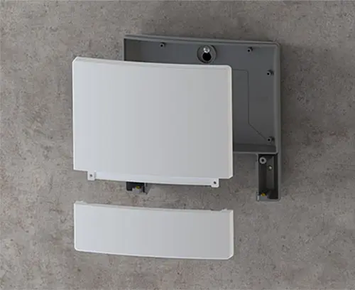 Корпус, состоящий из трёх частей, со скрытыми сборочными винтами. Современное сочетание светло-серого и тёмно-серого цветов. 4 монтажные бобышки в нижней части и в крышке основного отсека. Может применяться вне помещений благодаря высококачественной пластмассе АСА+ПК-ОС.