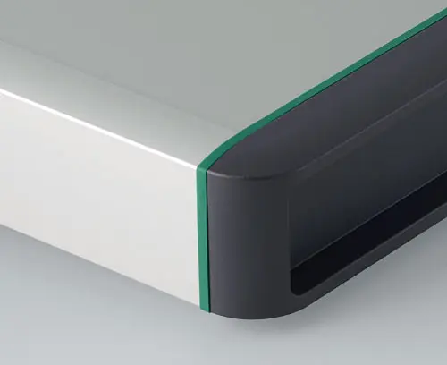 Горизонтальные направляющие и резьбовые каналы для крепления платы. Плоские области для установки разъёмов. Углублённая область на основной части для защиты дисплея, плёночной клавиатуры или элементов управления. Торцевые крышки с углублениями для защиты кабелей и соединителей.