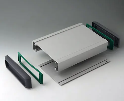 Горизонтальные направляющие и резьбовые каналы для крепления платы. Плоские области для установки разъёмов. Углублённая область на основной части для защиты дисплея, плёночной клавиатуры или элементов управления. Торцевые крышки с углублениями для защиты кабелей и соединителей.