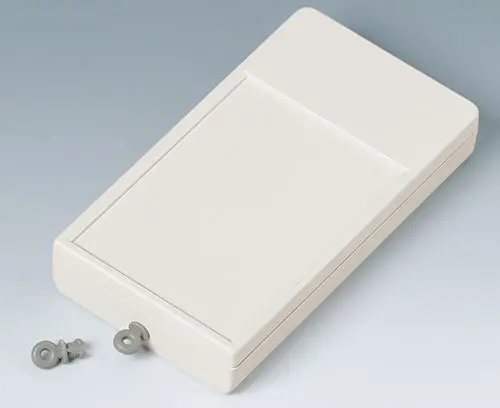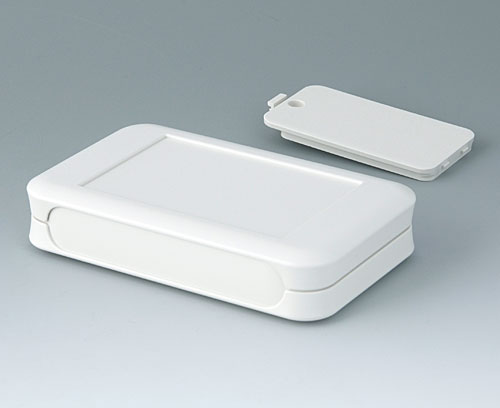 SMART-CASE M, Vers. II Ergonomic handheld case composed of two parts. Location at the front along with a screw in the center of the case. Possiblities for fixing PCBs in top and base part. Polished front area for utmost effectiveness when exposed to infra-red light. Integrated supports for two 1,5 V micro cells (AAA).