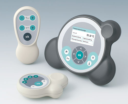 An enclosure that can be held and operated with two hands. Two-part enclosure design with symmetrically positioned gripping areas. Recessed surface for membrane keyboards. Separate recess for special functions. Attachment domes for a PCB in the top part.