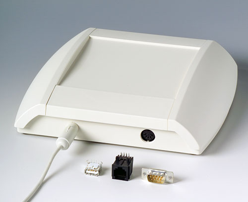 Four-part case. The bottom part can be fixed directly to the wall, the top part will be assembled by means of screws from the front. 2 side trims close the case. If required, the trims can also be locked, thus preventing unauthorised access. Recessed operating area to protect the membrane keyboard. Fastening pillars for PCBs in bottom and top part. Integrated supports for 2 x AA / 1 x 9 V.