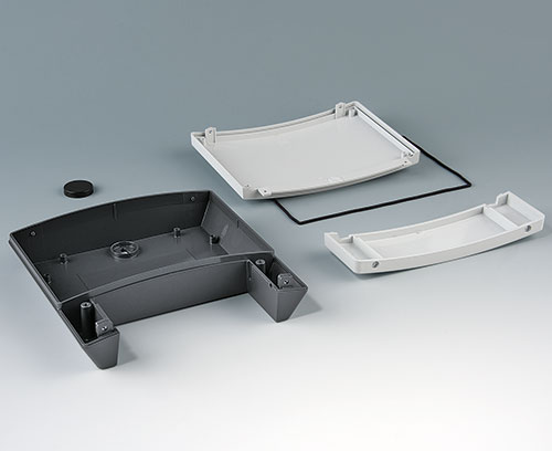 Three-part enclosure with a uniform appearance thanks to concealed screw connections. Modern colour combination of light grey and lava. 2 PCB levels with 4 attachment domes each in the electronics compartment. Can also be used out of doors thanks to the high-quality ASA+PC-FR material.