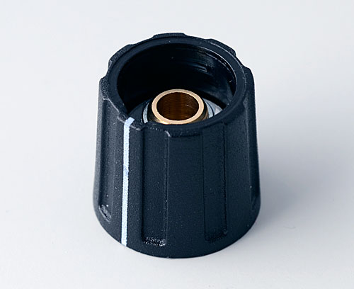 ROUND KNOB 16, with line Suitable for rotary potentiometer with round shaft ends according to DIN 41591. Collet system for convenient knob assembly from the front and simple adjustment (with adjustment key - sep. article). Center hole with chamfer. White marking.