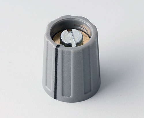 TOP-KNOBS 24 Suitable for rotary potentiometer with round shaft ends according to DIN 41591. Lateral screw fixing by hex-socket set screw (1.5 mm) and cup point.