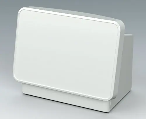 Order with COMMUNITEC M basic housing. Features a recessed area for protecting membrane keypads and integrating large-format displays up to 14" (35 cm), with a flat area below for front-mounted control elements and connectors. Includes integrated fastening pillars for PCBs or mounting plates. The operating panel is installed from the rear.