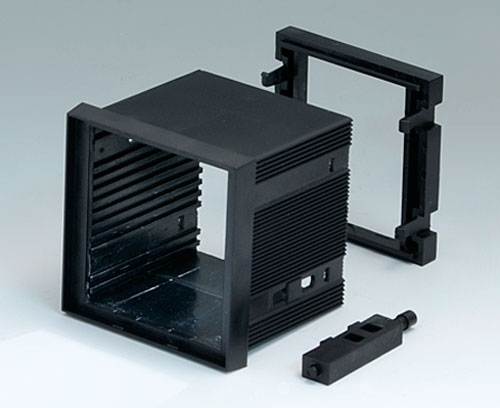 DIN-MODULAR CASE TYPE A Case and front frame are one single piece injection moulded. Rear frame as well as front and rear panels (accessory) are easily fitted by snap-on latches. With guide ridges for slide-in PCB mounting on 2 sides. Corresponding to DIN IEC 61554.