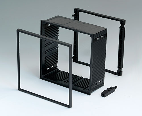 DIN-MODULAR CASE TYPE A Case with detachable front frame. The rear frame as well as well as the rear panel (accessories) will be simply snapped on. The front panel will be screwed at the edges. With guide ridges for slide-in PCB mounting on 4 sides. Corresponding to DIN IEC 61554.